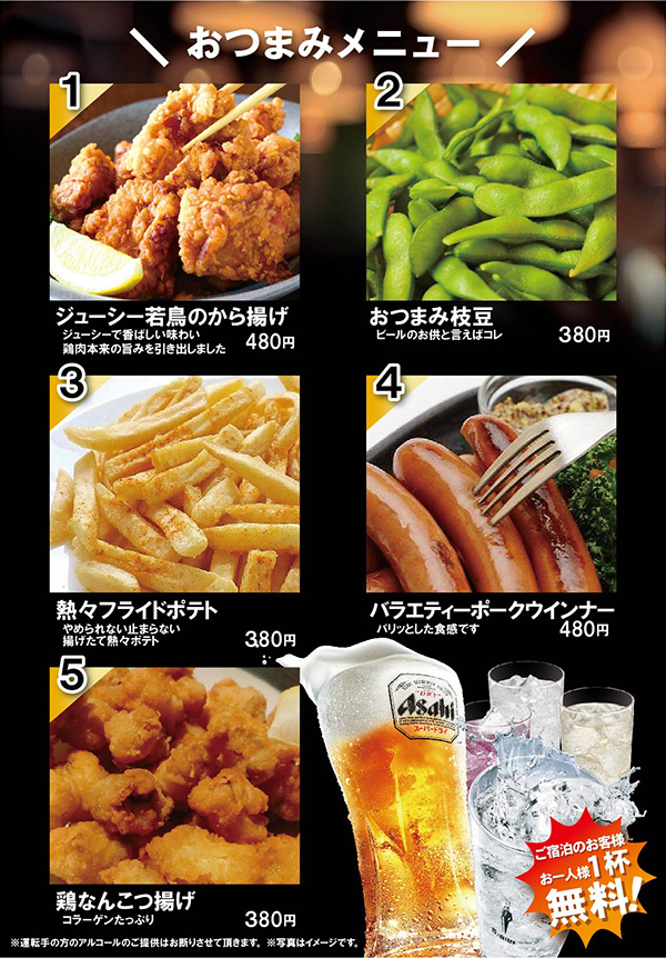 大人気の「宿泊でビールorサワー1杯無料」サービスに併せて、お酒の進むおつまみはいかがですか?居酒屋でも人気の高い5種のメニューをご用意。お一人で、みんなで分け合って、楽しいひとときをお過ごしください!