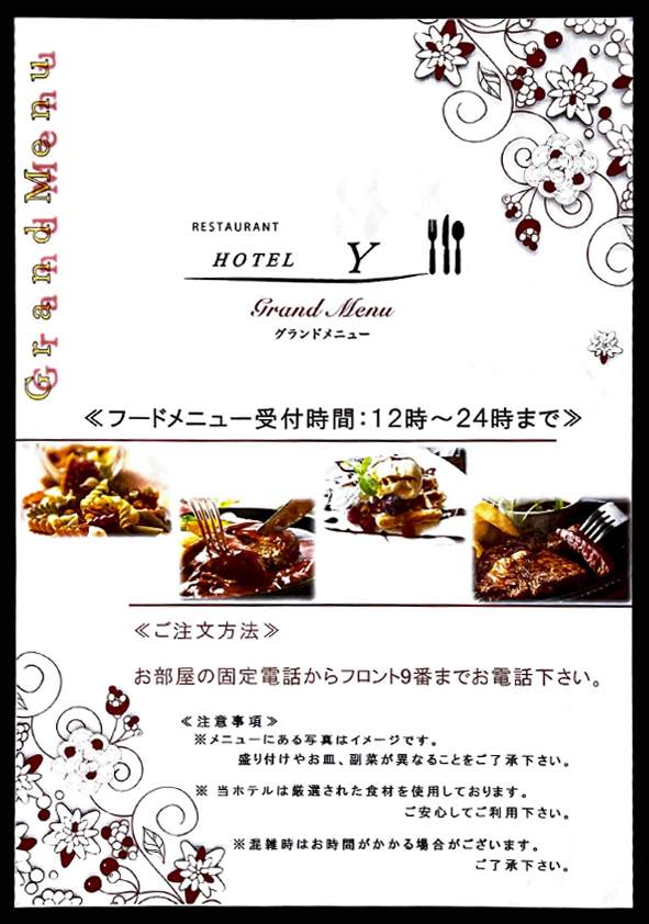 フードメニュー受付時間:昼12時~深夜24時お部屋の固定電話からフロント9番までお電話ください