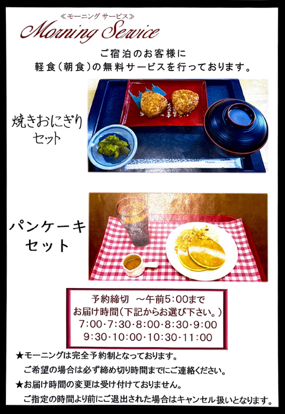 モーニングサービスはご宿泊の方に無料でお付けしております。午前5時までにご予約下さい
