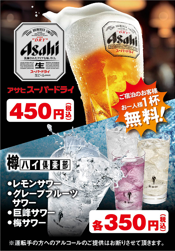 宿泊のお客様限定!お1人様一杯、ビールorサワーが無料!カップルでのご利用はもちろん、ビジネスユースにも