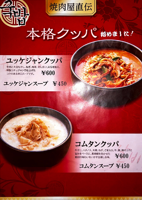 焼肉屋直伝、本格韓国料理クッパ!【赤】具沢山で特製コチュジャンがピリッと辛口のユッケジャンクッパと、【白】牛すじと野菜の風味豊かな優しいお味のコムタンクッパ。あなたはどっちを選ぶ!?ごはんの入らないスープタイプもお得にご用意しています。